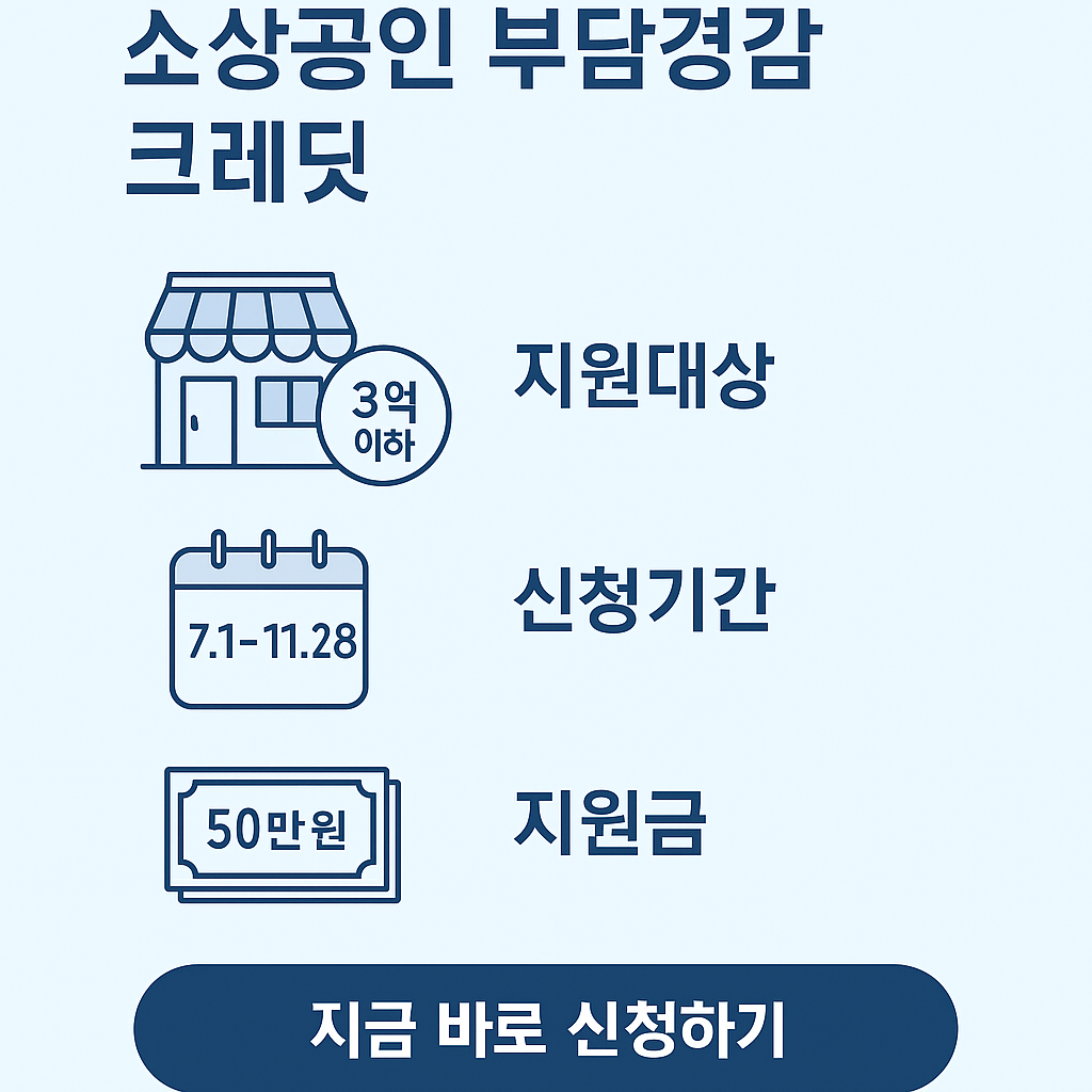 소상공인 부담경감 크레딧은 내수 부진으로 경영난을 겪는 소상공인을 위해 전기, 가스, 상·하수도 요금 및 4대 보험료 부담을 줄여주는 정책입니다. 선정된 소상공인에게는 50만 원 상당의 디지털 포인트가 지급되며, 등록된 신용·체크카드 또는 선불카드를 통해 지정된 공과금 결제 시 자동 차감됩니다.