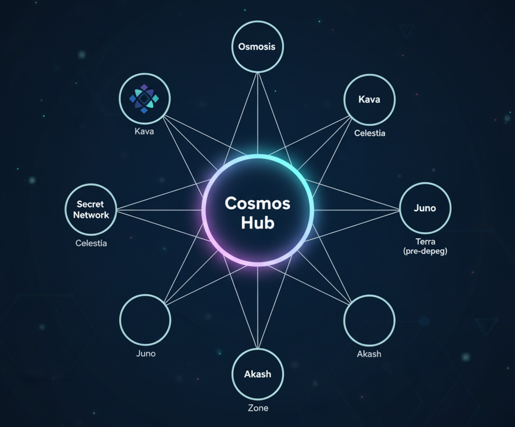 - Cosmos Hub – 중심 네트워크, 여러 존을 연결하는 중앙역 역할